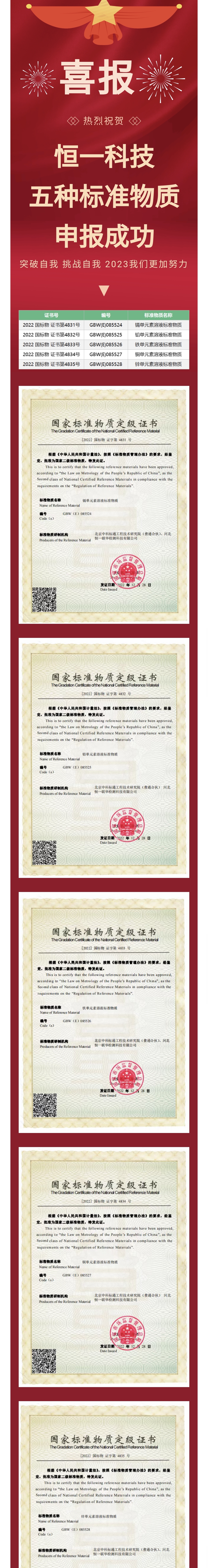 喜報丨恒一科技五種元素溶液標準物質申報成功!